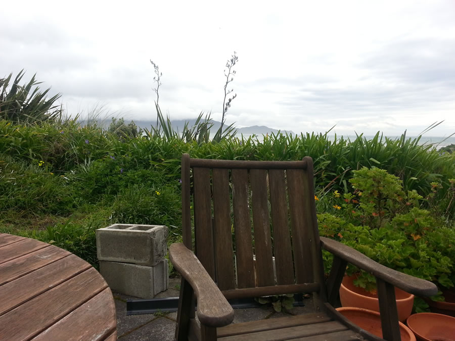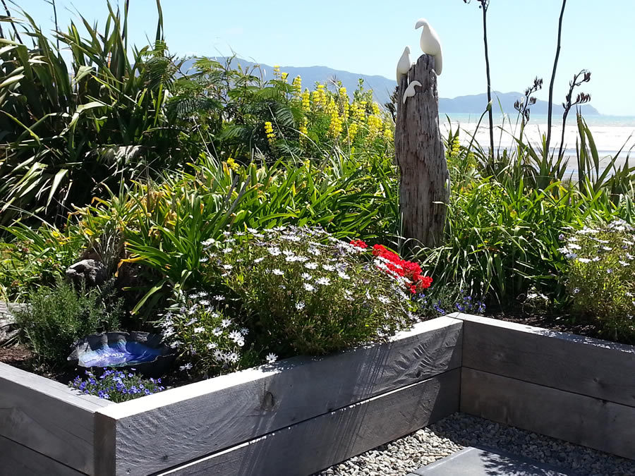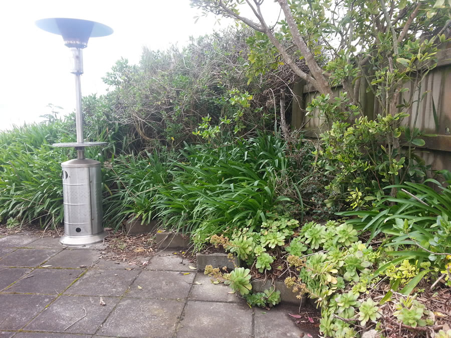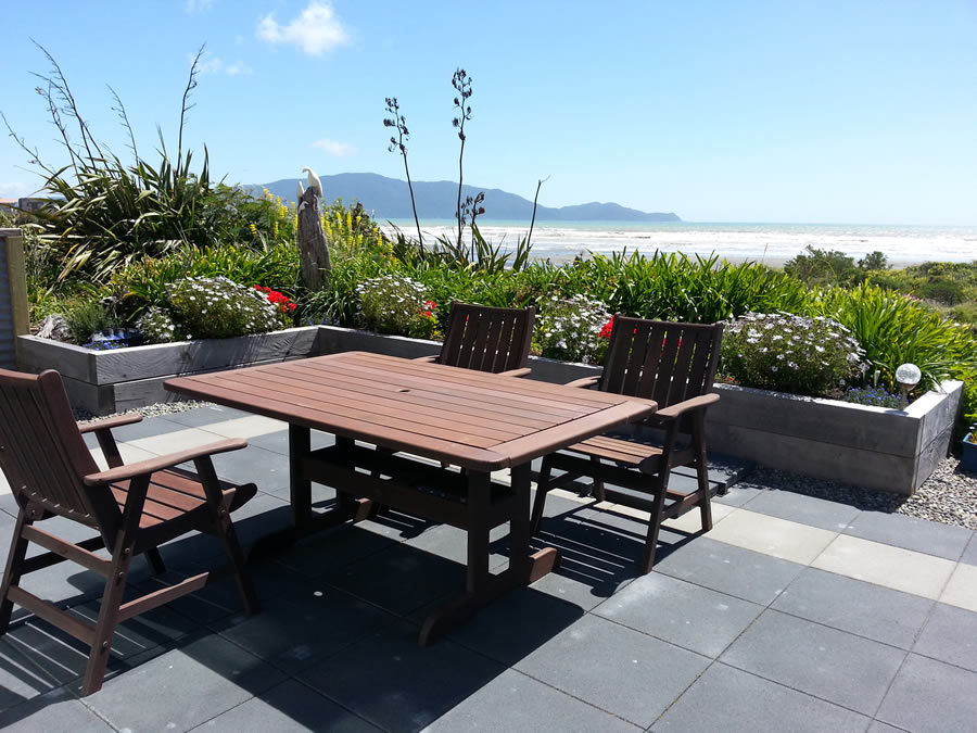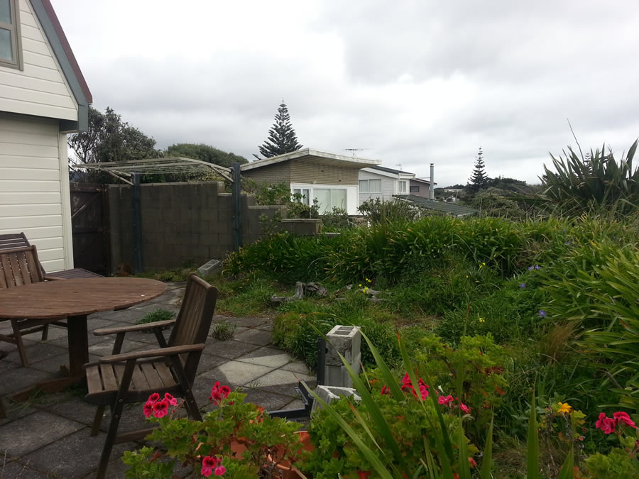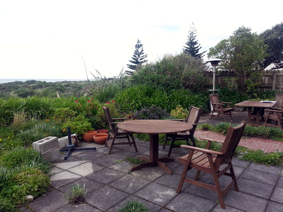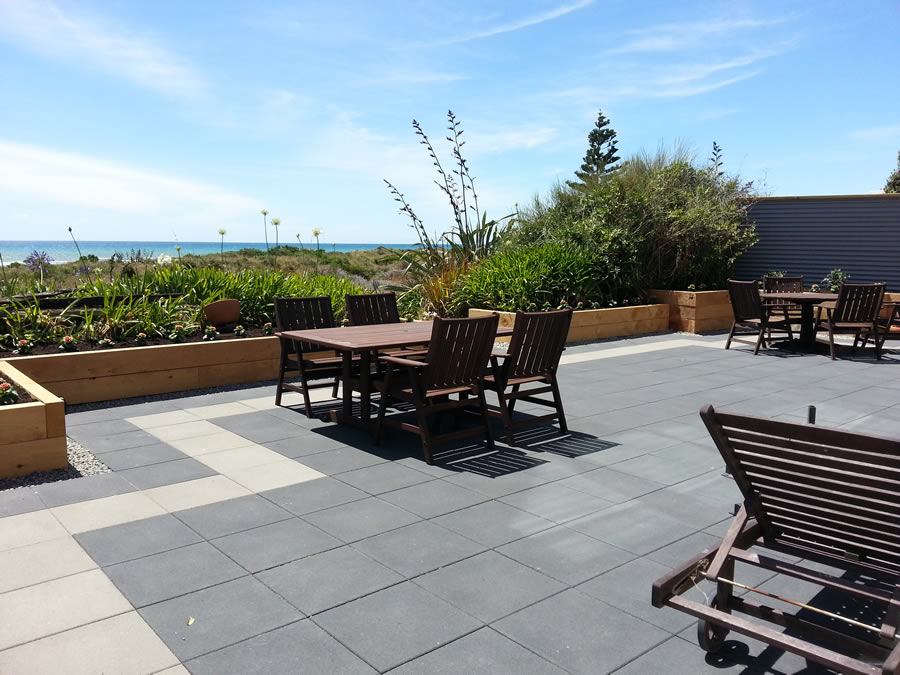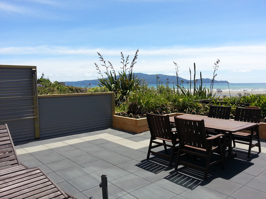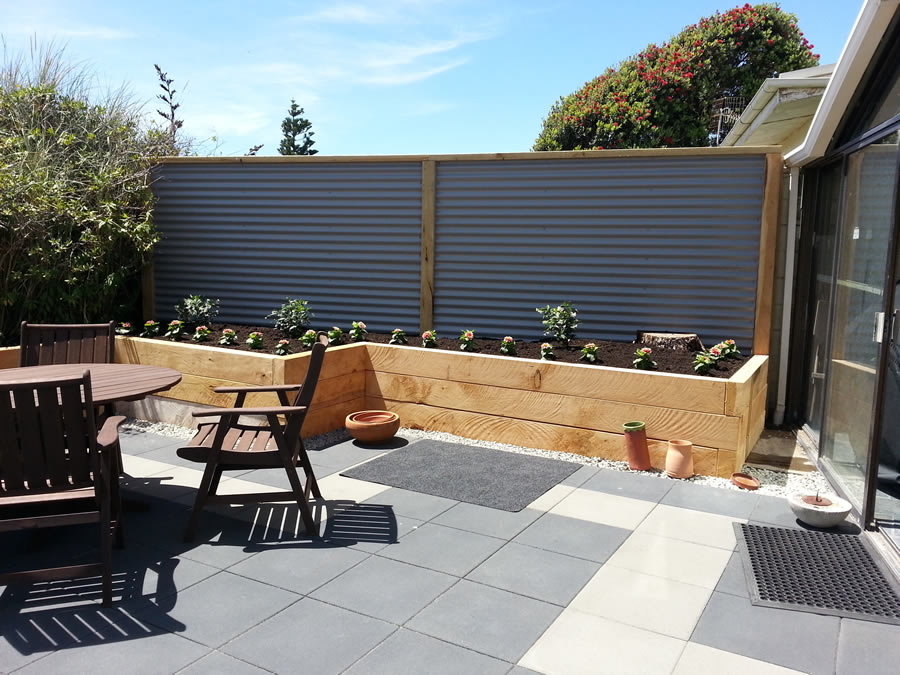 Update of beach house patio, seaward side of property. New paving; macrocarpa retained gardens; corrugated iron fence façade to screen existing block walls; custom gate blending corrugated iron with timber.